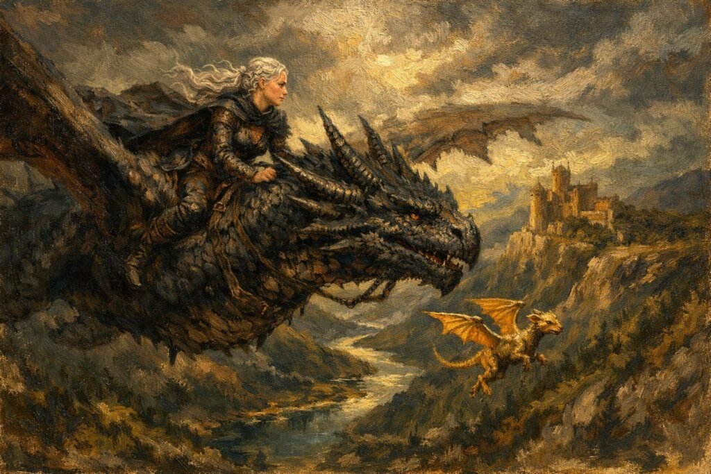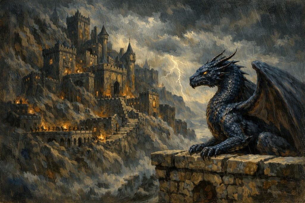 - Tairn (Tàirneanach): Imię to oznacza „Grzmot”. Jest to nie tylko opis potęgi smoka, ale także zapowiedź sygnetu Violet – władania błyskawicami. To klasyczny przykład „zapowiadania” (foreshadowing) poprzez onomastykę.